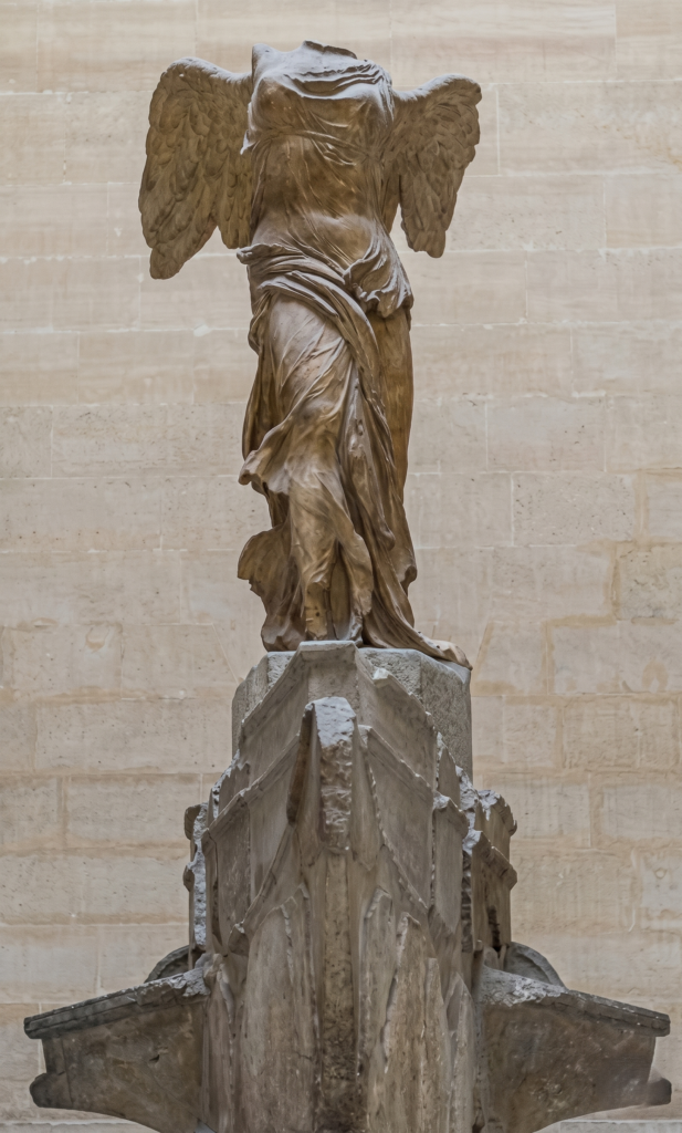 Around 190 BC, an unknown sculptor stood in a workshop — probably on the island of Rhodes — and began carving a block of white Parian marble into a goddess. The figure represents a goddess in motion, captured at the moment of landing. Wings back, chest forward, robes pressing against her body as if driven by sea wind, the moment her feet touched the prow of a warship after delivering the news of a naval victory. The sculptor demonstrated a high level of technical skill and control. The passage of time has reinforced that assessment.